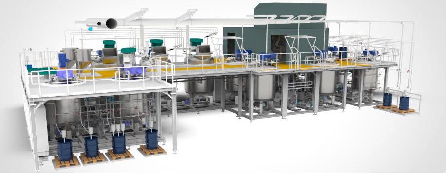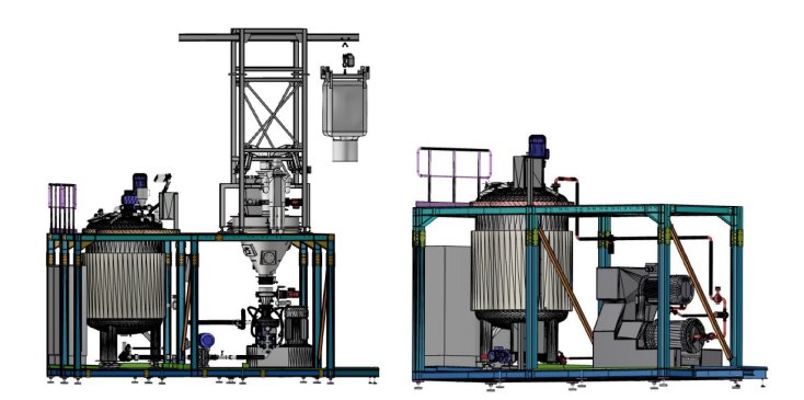上图显示了两个模块。左边的模块由ψ-MIX在线混合系统和一个大袋进料站组合而成,整个粉体进料过程可以是密闭的,并配备精细除尘器。右边的模块为研磨装置,由ZETA棒销式研磨系统、储料罐和泵组成。